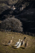 Wie viele Kurven noch? Die Straßen sind eng. Sind wir überhaupt richtig? Ich kurble das Fenster herunter und frage nach dem Weg. Obwohl es Februar ist, weht der typische Wind herein, ein Geruch, den wir mit Südtirol verbinden, seit wir an diesem Buch arbeiten. Nach Wiesen, nach Wald, nach Kuhmist. In dieser kalten Jahreszeit begegnen uns keine anderen Touristen. Dennoch präsentiert sich uns der ganze Zauber Italiens nördlichster Provinz. Er offenbart sich gerade in dieser kargen Stimmung. Nicht so offensichtlich wie im Frühling, wenn die Knospen sprießen, oder im Sommer, wenn das Land im Sonnenlicht leuchtet. Die Schönheit ist nun stiller, geheimnisvoller, lässt uns tiefer atmen und innehalten.